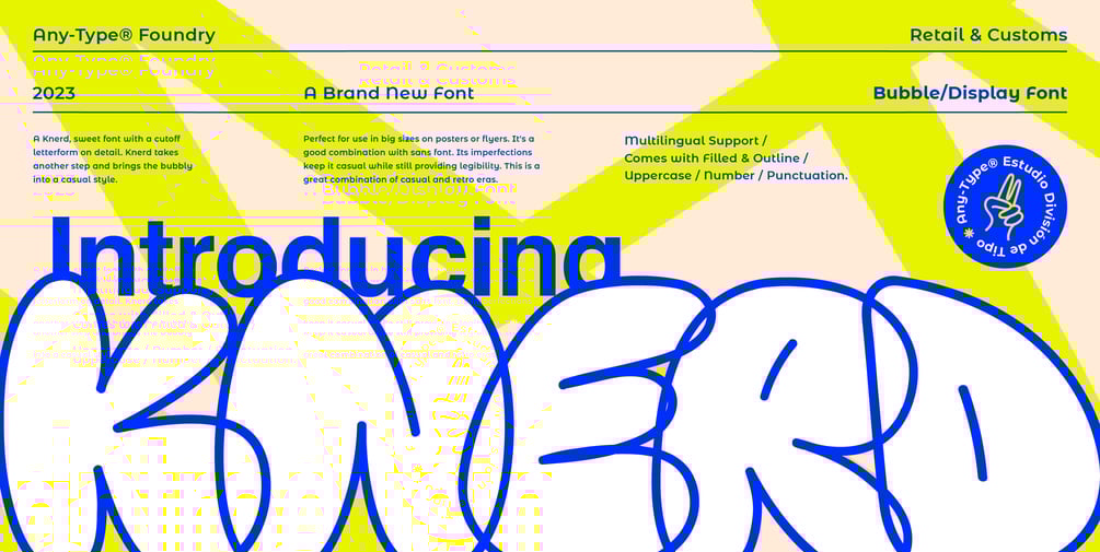 A bubble, rounded, sweet font with graffiti touch and a cutoff letterform on detail. Knerd takes another step and brings the bubbly into a casual style. Perfect for use in big sizes on posters or flyers. It's a good combination with sans font. Its imperfections keep it casual while still providing legibility. This is a great combination of casual and retro eras.